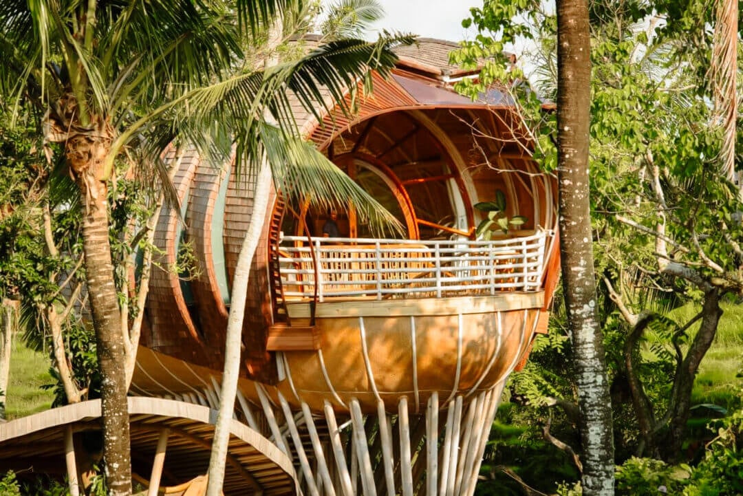 One of the best bamboo houses in Bali is the luxurious eco-conscious Bambu Indah Resort. Tucked harmoniously between the green jungles of Ubud, the resort features 20 unique houses that allow you to fully immerse yourself in the area’s stunning nature.