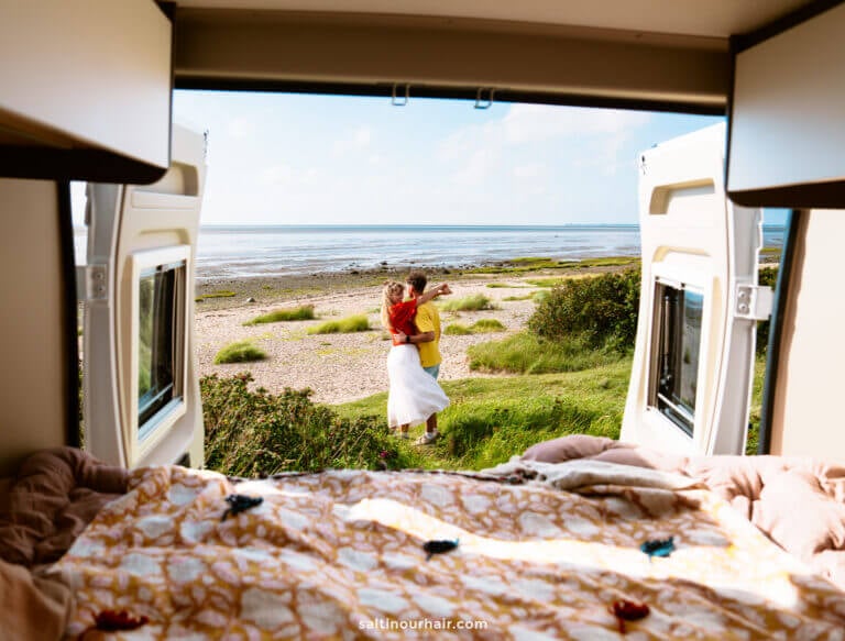 On Day 2 of our Denmark itinerary, we headed for the wild and untamed Rømø Island. The long causeway across the water feels like a road into the sea, and the reward is one of the widest beaches in Europe. We were actually able to drive our camper straight onto the sand, which was a surreal moment as we looked out at the four kilometers of open shoreline in front of us.